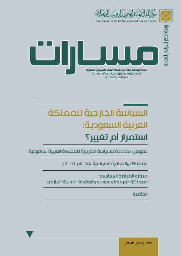 تعتمد المملكة العربية السعودية في سياستها الخارجية على دعم الاستقرار السياسي، والأمن الاقتصادي في المنطقة. وكانت المملكة، ولا تزال حريصة، على وجود علاقات متينة مع جيرانها مع احتفاظها بعلاقاتها الوثيقة مع حلفائها على الصعيد الدولي. إلا أن الأحداث التي صاحبت الثورات العربية تضع أمام الجميع تحديات جديدة، لا على مستوى الشرق الأوسط فحسب، بل على مستوى العالم بأسره. لذا كان لزاماً على المملكة أن تغيّر من أدواتها السياسية مع التزامها -في الوقت ذاته- منطلقاتها الأساسية. وسيبحث هذا العدد من «مسارات» في السياسة الخارجية الجديدة للمملكة العربية السعودية لتقويم هذا التوجه الجديد.