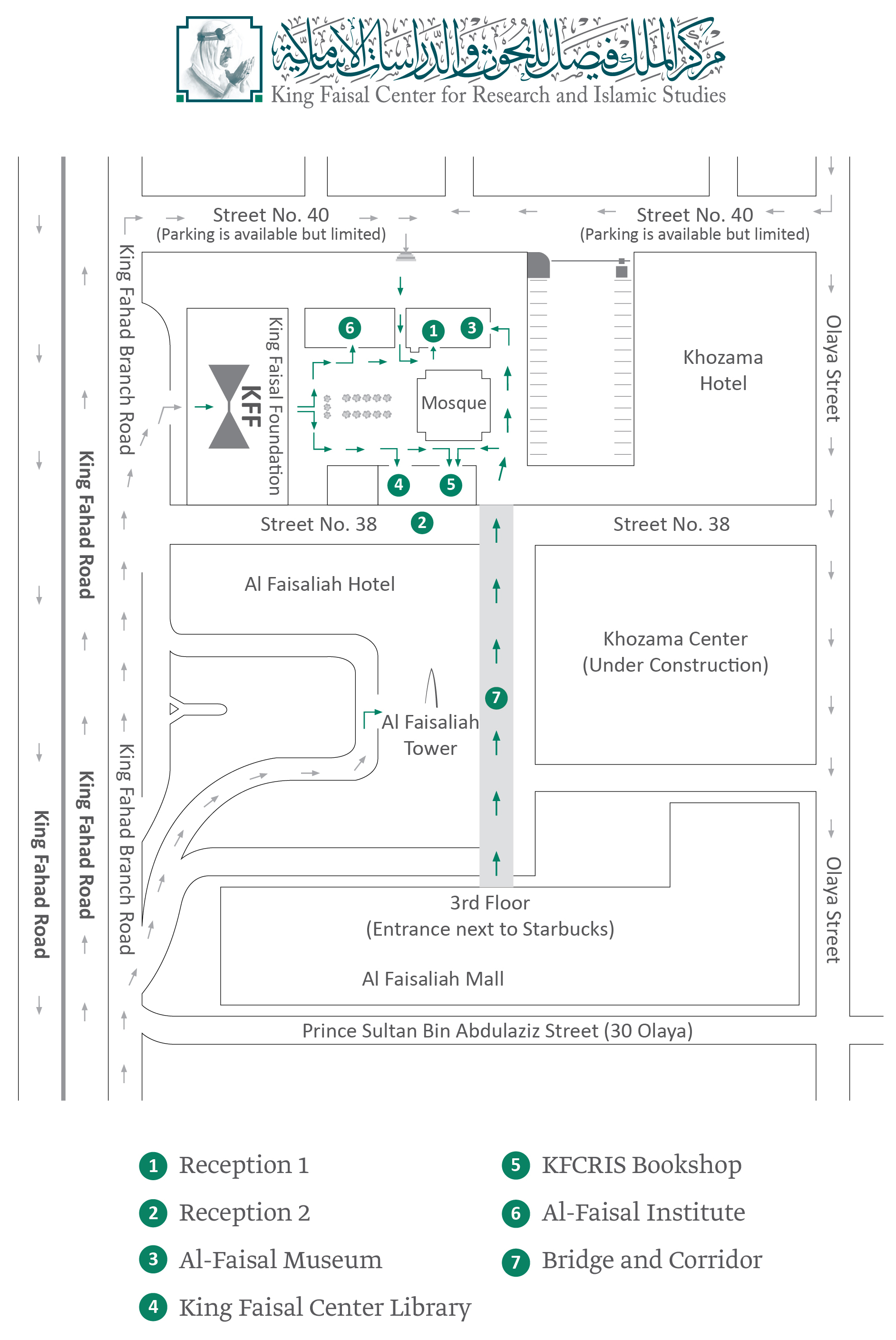 费萨尔国王学术与伊斯兰研究中心毗邻费萨尔基金会和费萨尔塔。从法赫德国王路进入费萨尔基金会大楼,上楼梯,穿过广场到达清真寺,中心入口位于左侧.