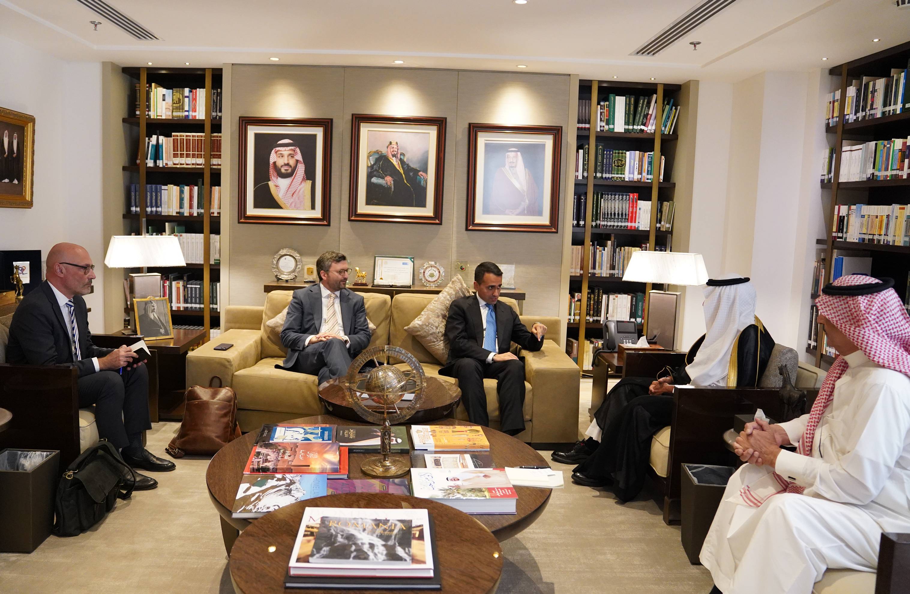 费萨尔国王学术与伊斯兰研究中心主席图尔基·费萨尔亲王在办公室会见欧盟海湾阿拉伯国家特别代表路易吉·迪·马约。欧盟海湾阿拉伯国家特别代表办公室主任弗罗林·尼塔、欧盟驻沙特、巴林、阿曼使团副团长雅普拉参与会见。