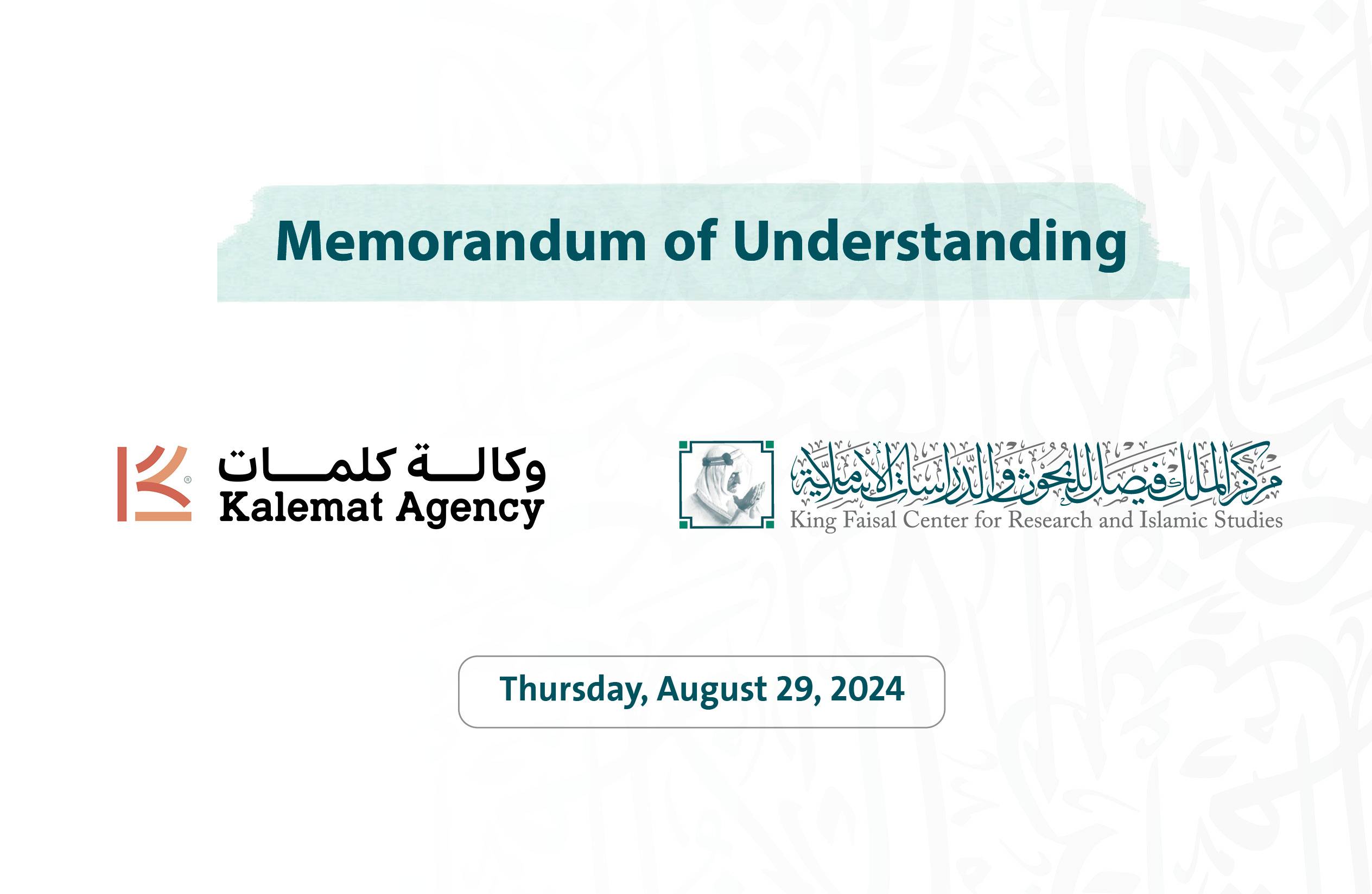 伊历1446年2月25日/公历2024年8月29日(周四),费萨尔国王学术与伊斯兰研究中心与卡利马特机构签署谅解备忘录。中心助理秘书长伊布拉辛·达基萨尔、卡利马特机构首席执行官法赫德·艾勒奥达代表双方签字。
