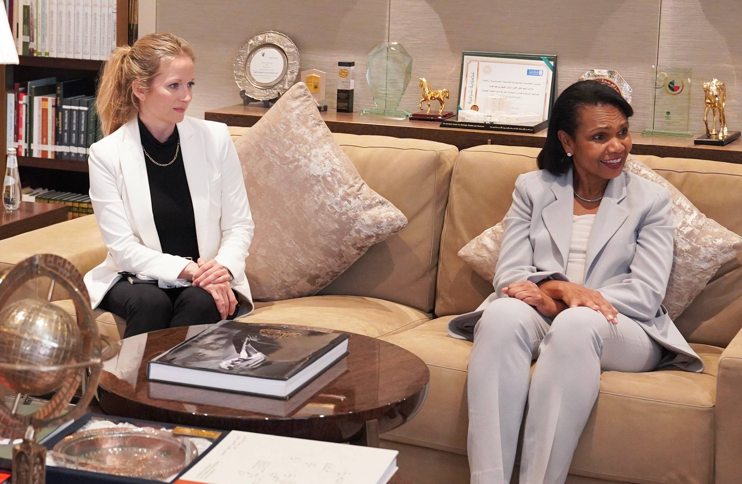 费萨尔国王学术与伊斯兰研究中心主席图尔基·费萨尔亲王在其办公室会见美国前国务卿康多莉扎·赖斯、斯坦福大学胡福研究所首席职员兼董事会事务官斯蒂芬妮·霍尔。
