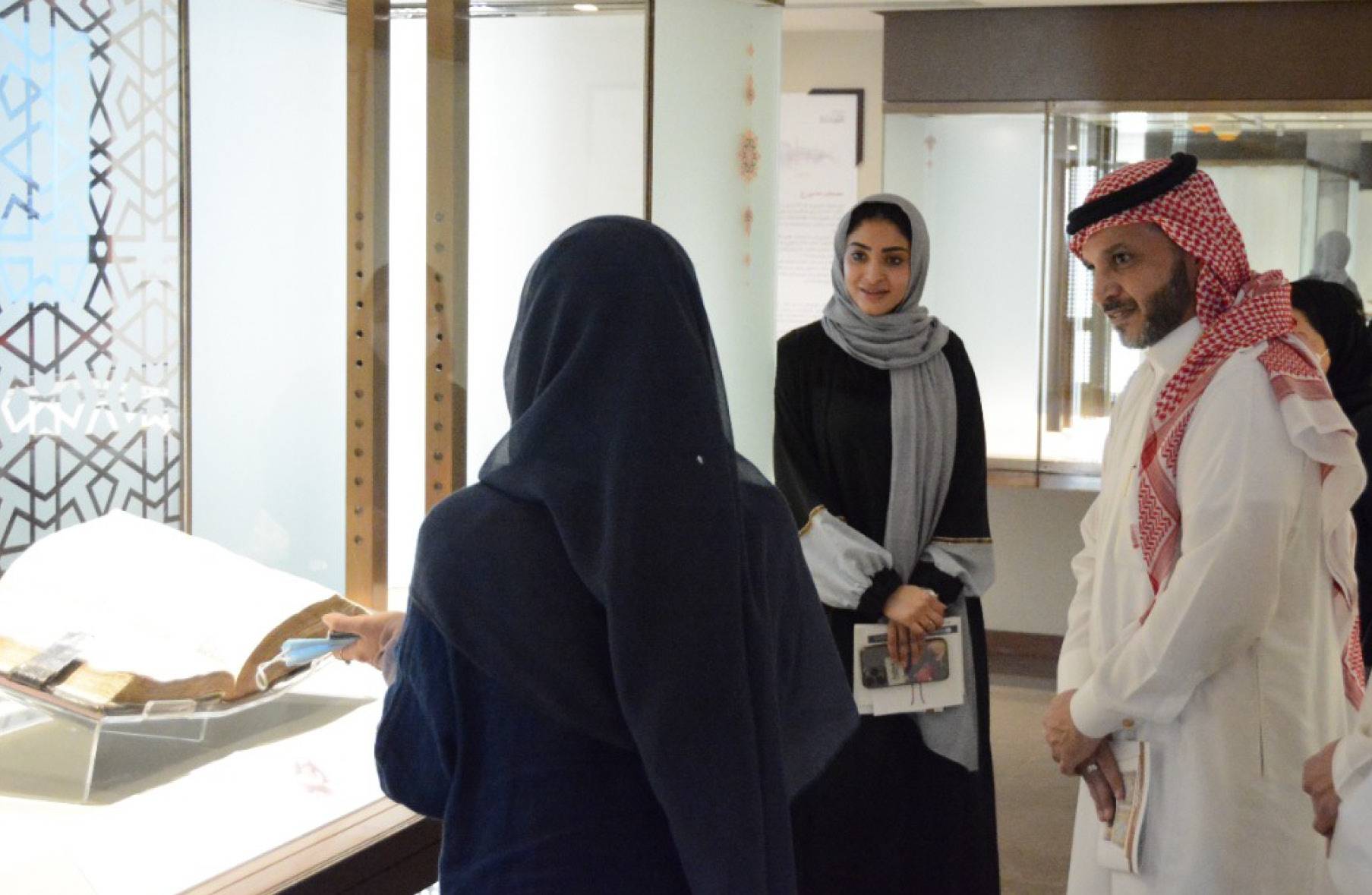 On Thursday, March 10, 2022, the King Faisal Center for Research and Islamic Studies (KFCRIS), received a delegation from the Planning and Vision Realization Agency at the Ministry of Communications and Information. The delegation visited the Exhibition Asfār at Al-Faisal Museum for Arab-Islamic Art.