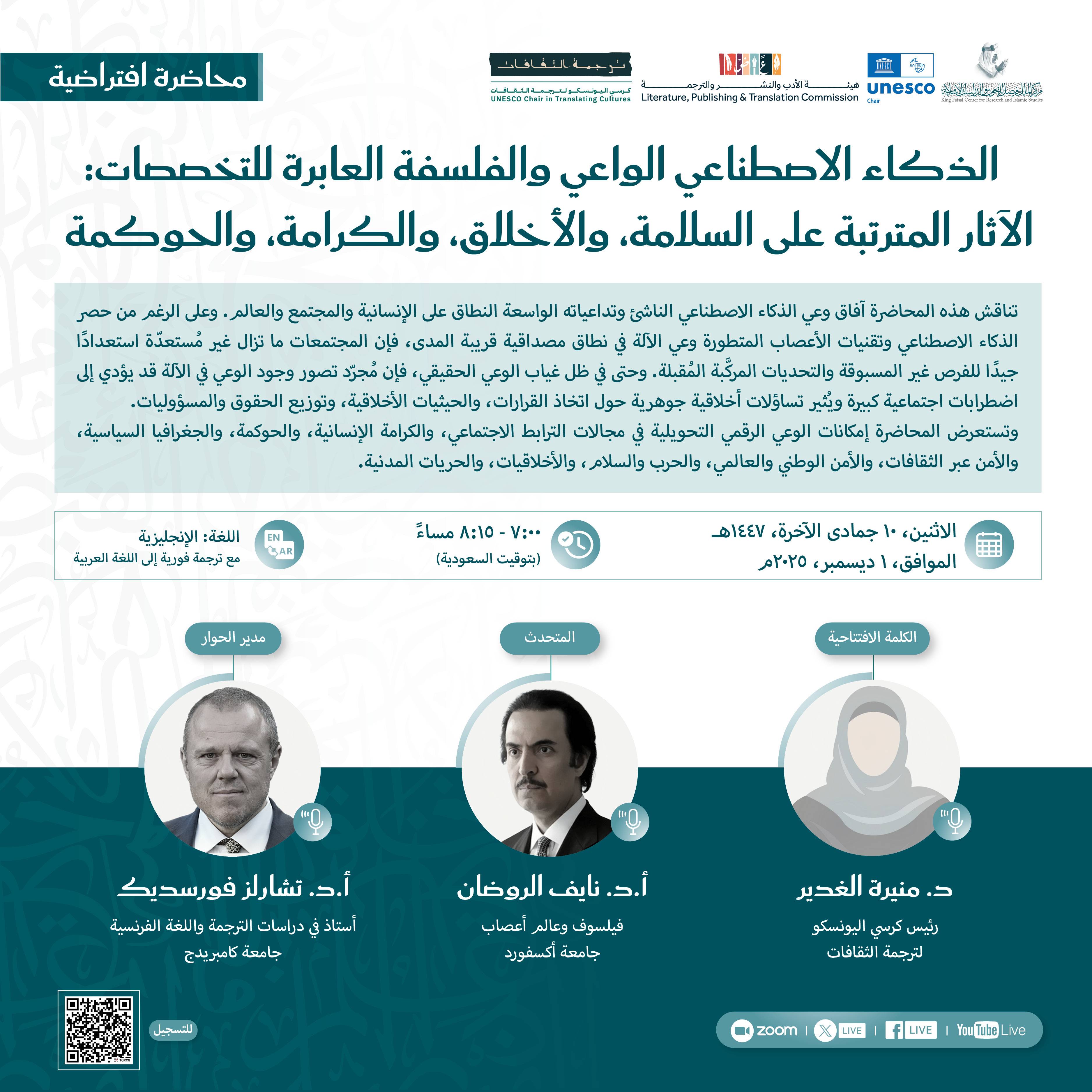 محاضرة افتراضية: الذكاء الاصطناعي الواعي والفلسفة العابرة للتخصصات: الآثار المترتبة على السلامة، والأخلاق، والكرامة، والحوكمة...
