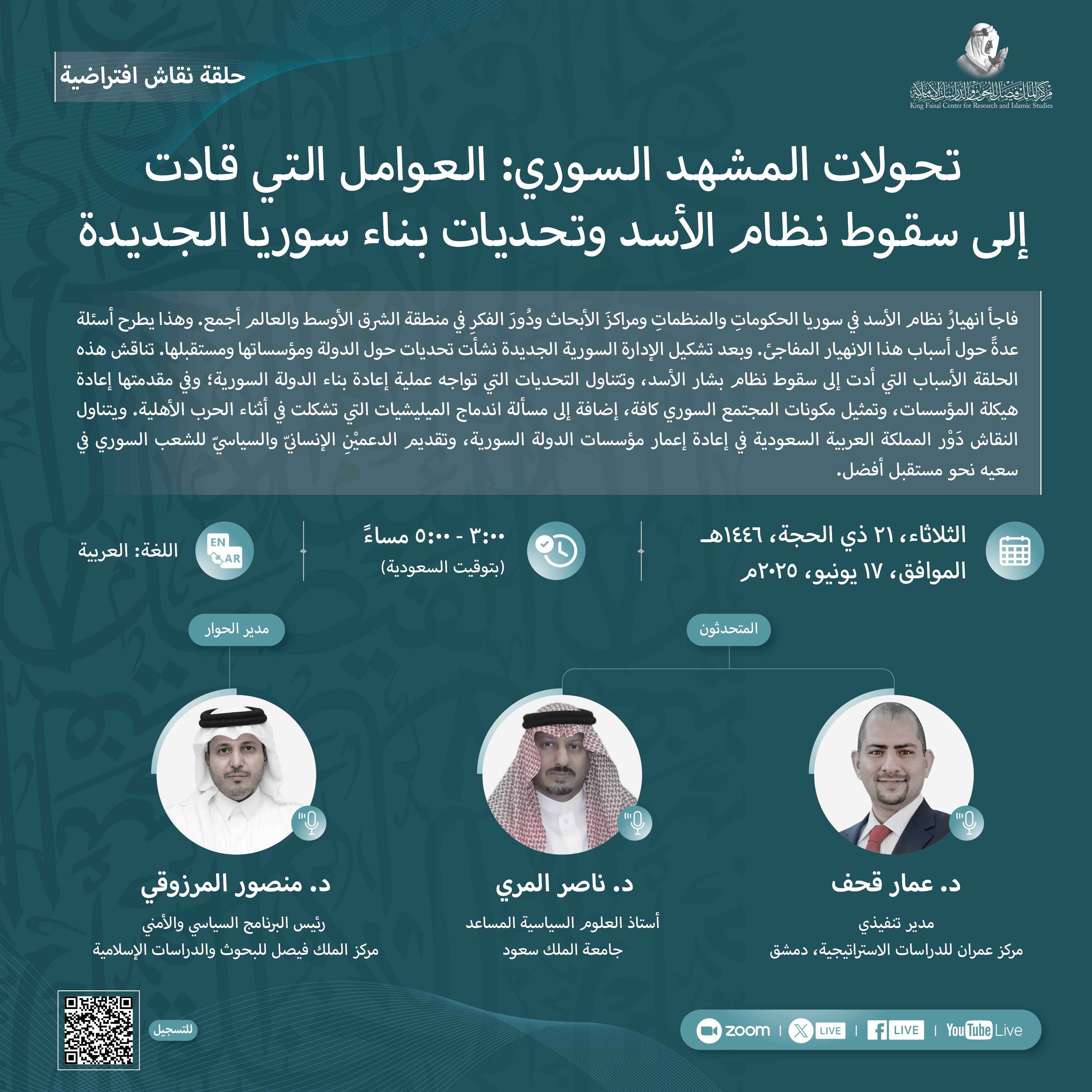 حلقة نقاش افتراضية: تحولات المشهد السوري: العوامل التي قادت إلى سقوط نظام الأسد وتحديات بناء سوريا الجديدة...