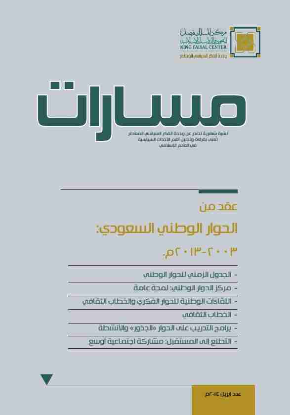 يسعى هذا العدد من مسارات، وبعد مرور عقد علىإنشاء المركز في عام 2003م، إلى استجلاء الصورة، وإدراك المزيد عن تلك المؤسسة: (مركز الحوار الوطني) في المملكة العربية السعودية، وهل كانت مناشطه تمثل محاولة ناِجعة لمعالجة القضايا الاجتماعية والسياسية التي تعبر بدقة عن تطلعات المجتمع السعودي المعاصر واهتماماته، من خلال تقويم أهمية اللقاءات الوطنية للحوار الفكري، ليس هذا فحسب، بل أيضاً من خلال الاهتمام الذي يوليه بالخطاب الثقافي الذي انبثق مؤخراً، ومناقشة تأثير تلك المبادرة بوصفها فضاء للنقاش الفكري. علاوة على ذلك، يناقش هذا العدد برامج التدريب والأنشطة الحوارية الأخرى في المركز التي لا يعرف عنها إلا القليل؛ على سبيل ال