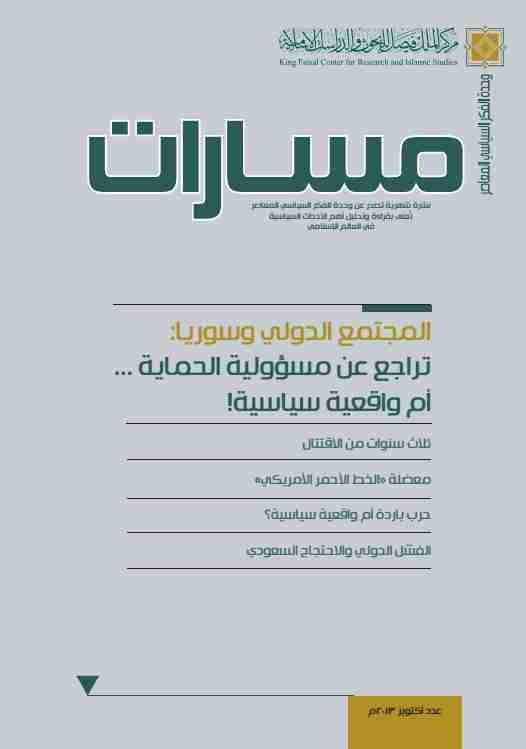 تتطور الأحداث في سوريا بعد إتمام الثورة شهرها الثلاثين عقب اندلاعها في ربيع الثاني 1432هـ/ مارس 2011م، ويظهر للمراقب مدى تغير مفهوم التدخل الإنساني الذي قدمت مسارات تحليلاً تفصيلياً له منذ ظهوره وحتى تطور مفهومه على ضوء مبادئ مسؤولية الحماية وتطبيقها في ليبيا 1432هـ/2011م ومالي 1434هـ/ 2013م (عدد مايو 2013). تُركت مبادئ الحماية جانباً بعد التردد الدولي في كيفية التصرف حيال ما يجري في سوريا بعد قصف النظام الغوطة بالأسلحة الكيميائية. هذا التردد بين أهمية إعادة النظر في مبدأ التدخل الإنساني وإعادة التقويم لفاعليته وجدية المجتمع الدولي أيضاً في خوض حرب جديدة في الشرق الأوسط. ففي حين لم يفشل الغرب كلياً في الحشد الدولي لضرب النظام السوري، لكنه وجد مخرجاً من حرج المساءلة عن مدى التزام الولايات