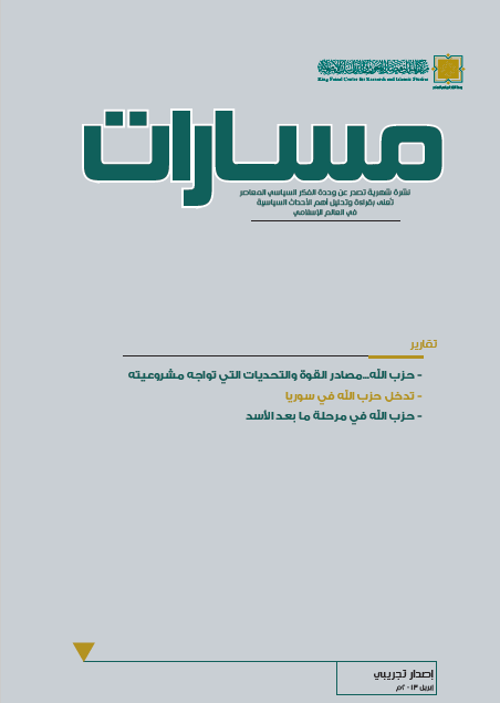 يمر حزب الله بمرحلة مصيرية في مسيرته، حيث تتعرض مشروعيته ومصادر قوته لتحديات ضخمة سيكون لها أبلغ الأثر على مستقبل الحزب. فبعد أن وصل الحزب إلى ذروة الشعبية لبنانياً وعربياً بعد حرب يوليو 2006م، يعاني الآن من تراجع مكانته ومشروعيته. فتبعيته لإيران ومشاركته في أعمال إرهابية وتأييده العسكري والسياسي واللوجستي للنظام السوري في مواجهة الثورة أدى إلى إمكانية وضعه على القوائم العالمية للإرهاب ومحاصرته سياسياً ومالياً. كما أن استقواءه بالسلاح لفرض واقع سياسي جديد في لبنان، وتورط بعض مسؤوليه في فضائح مالية كبيرة أثرت على مكانة الحزب داخل المجتمع اللبناني. في هذا العدد، سيتم عرض أهم مصادر قوة الحزب والتحديات التي تواجهه، وعن مشاركته العسكرية مع النظام السوري لمواجهة الثورة، مع تقديم رؤية استشرافية للحزب في مرحلة ما بعد سقوط نظام بشار الأسد