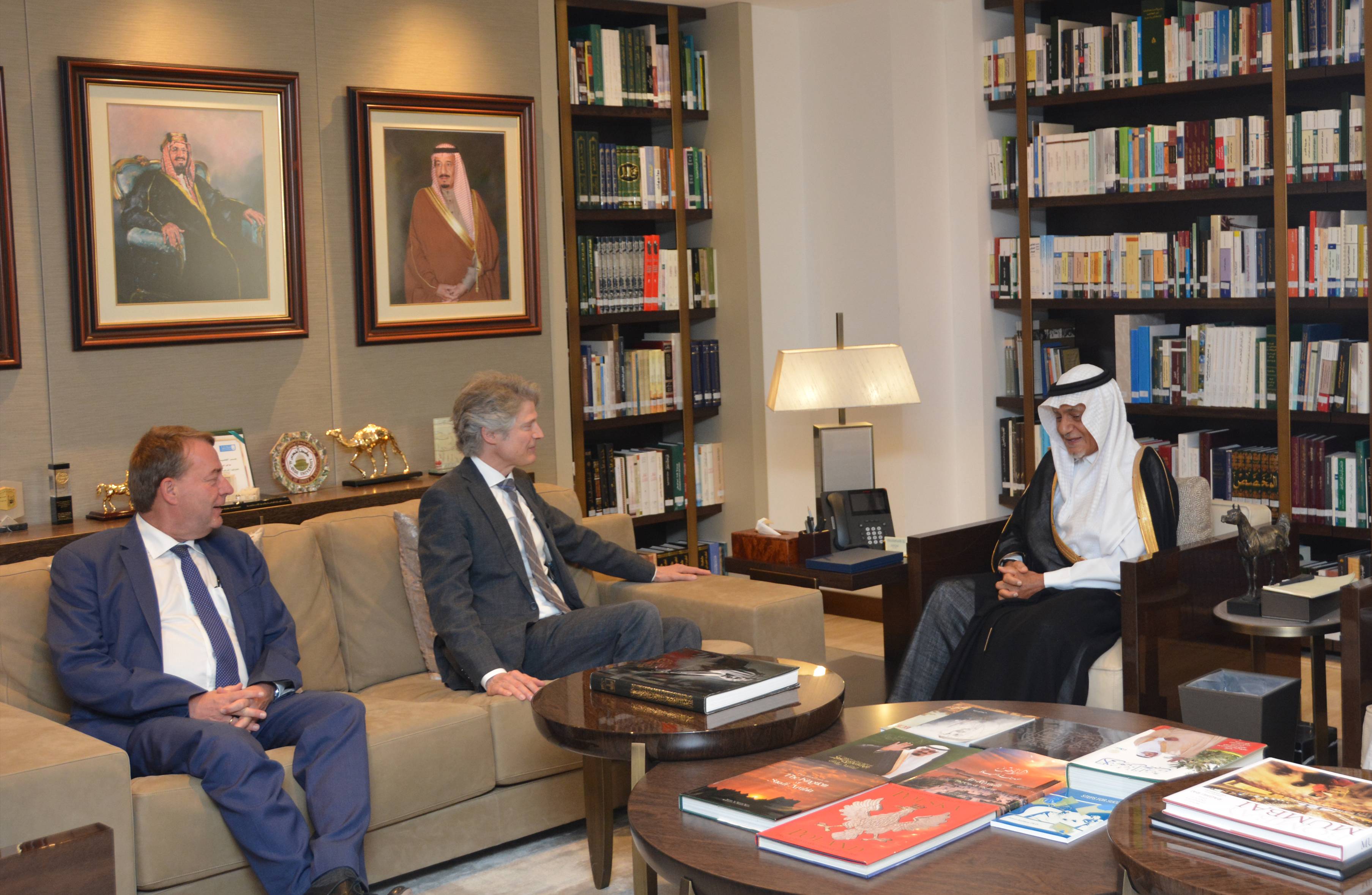 费萨尔国王学术与伊斯兰研究中心主席图尔基·费萨尔亲王在其办公室会见德国驻沙特大使迪特·拉梅勒率领的代表团。