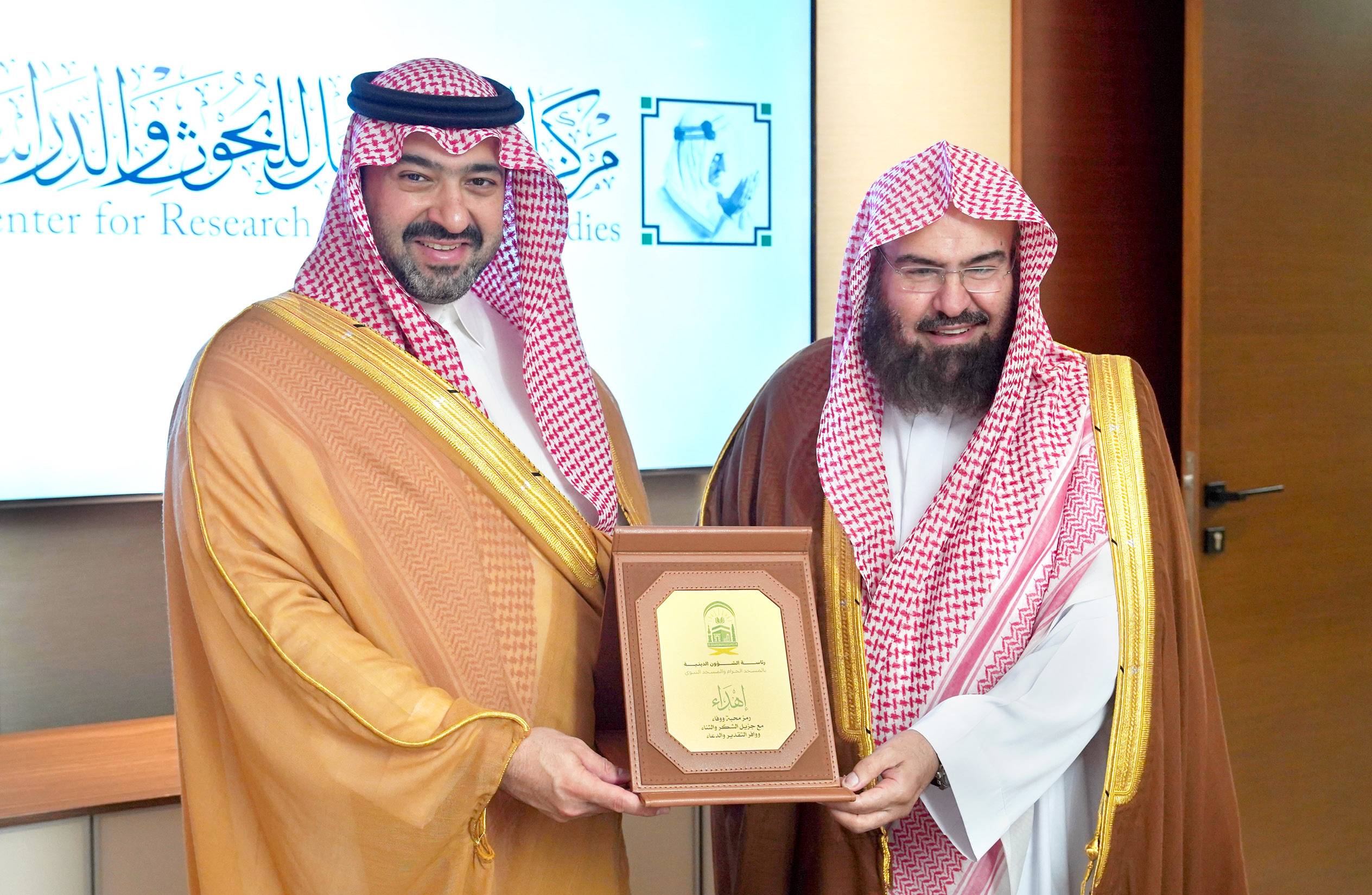 伊历1446年5月4日/公历2024年11月6日(周三),费萨尔国王学术与伊斯兰研究中心秘书长马哈·宾特·穆罕默德·费萨尔公主、费萨尔档案馆馆长哈立德·本·沙特·阿卜杜拉·费萨尔亲王会见两圣寺宗教事务委员会主席谢赫阿卜杜拉赫曼·本·阿卜杜勒阿齐兹·苏代斯。