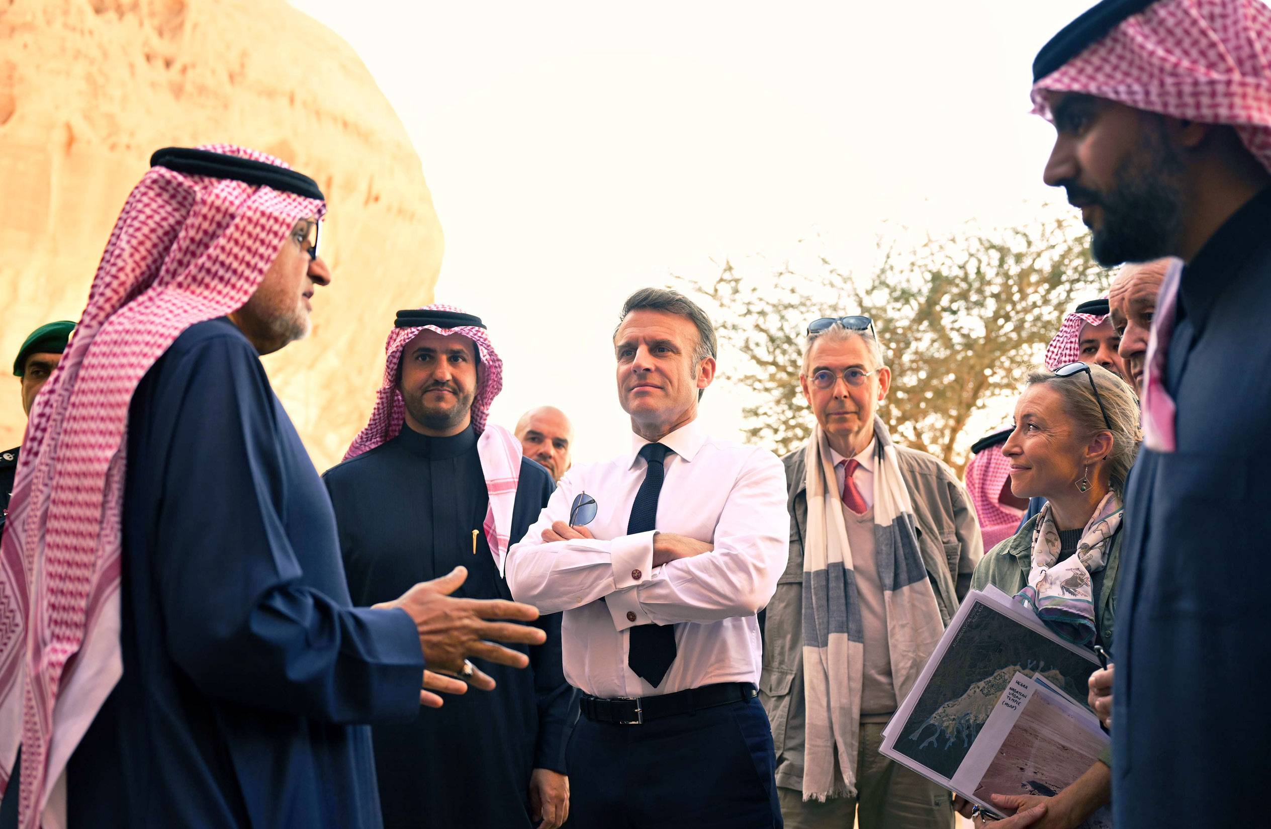 On Wednesday, December 4, 2024, Dr. Solaman AITheeb, Cultural Advisor at KFCRIS and the Royal Commission for AlUla, provided HE French President Emmanuel Macron with an explanation of the archaeological and historical landmarks during his tour of the historic Al-Hijr (Hegra) area.