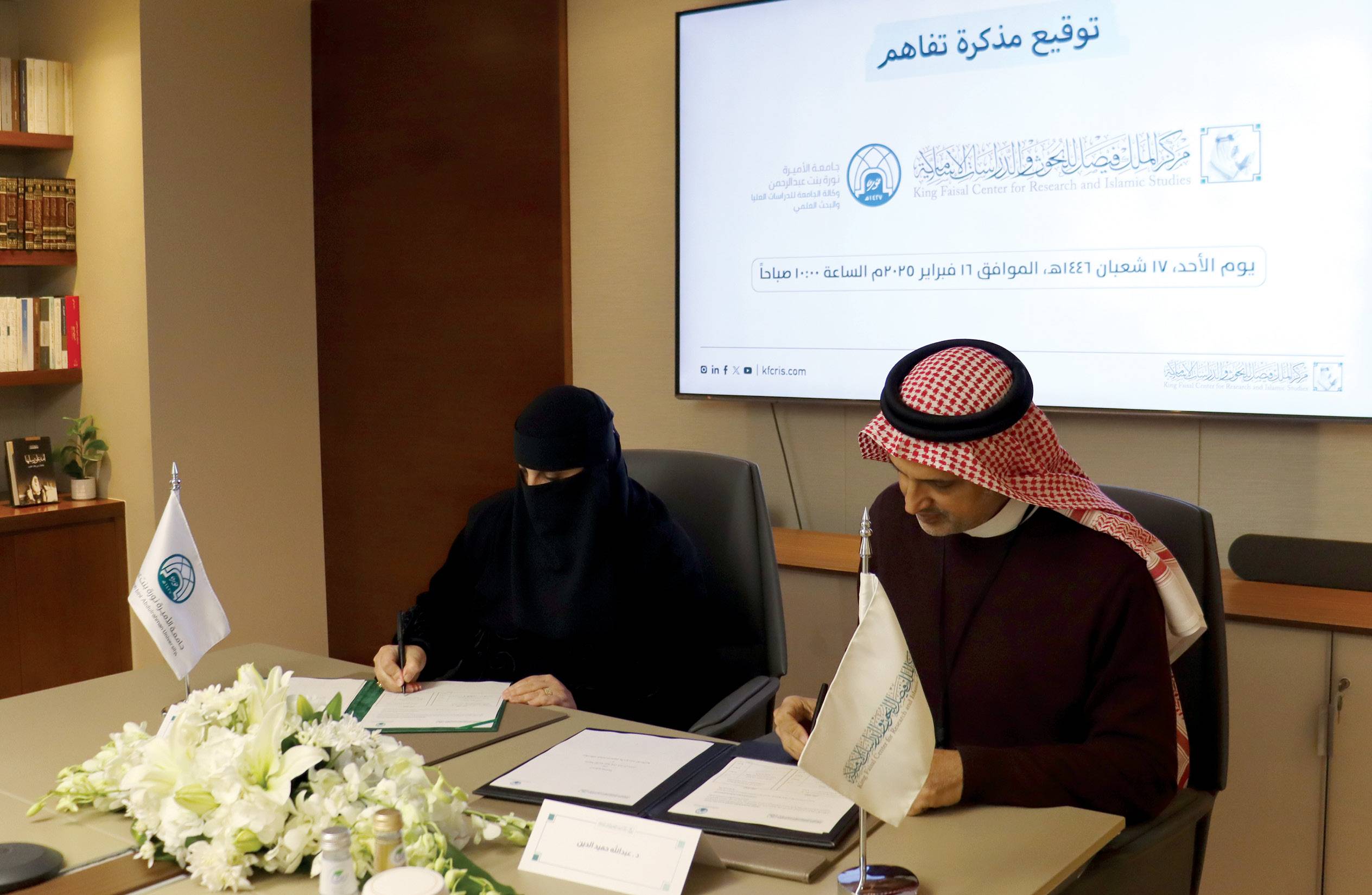 On Sunday, February 16, 2024, the King Faisal Center for Research and Islamic Studies (KFCRIS) signed a memorandum of understanding (MoU) with Princess Nourah bint Abdulrahman University. In the signing of the MoU, KFCRIS was represented by Dr. Abdullah Hamidaddin, Assistant Secretary-General for Scientific Affairs, and PNU was represented by Dr. Fawzyah bint Suleiman Al-Amro, Vice President for Graduate Studies and Scientific Research.
