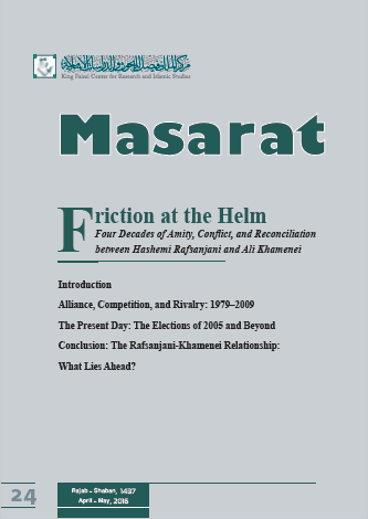 This issue of Masarat traces the ongoing competition and ideological clash between the Supreme Leader Ayatollah Ali Khamenei, and former president Akbar Hashemi Rafsanjani, which for the past thirty years has had a significant impact on the Iranian political scene. The 24th issue of Masarat focuses on the history of the on-off rivalry between the two prominent figures, and, in turn, how the ensuing tension has impacted many key moments throughout the Republic’s history. It also explores how such tension could possibly affect Iran’s elite.